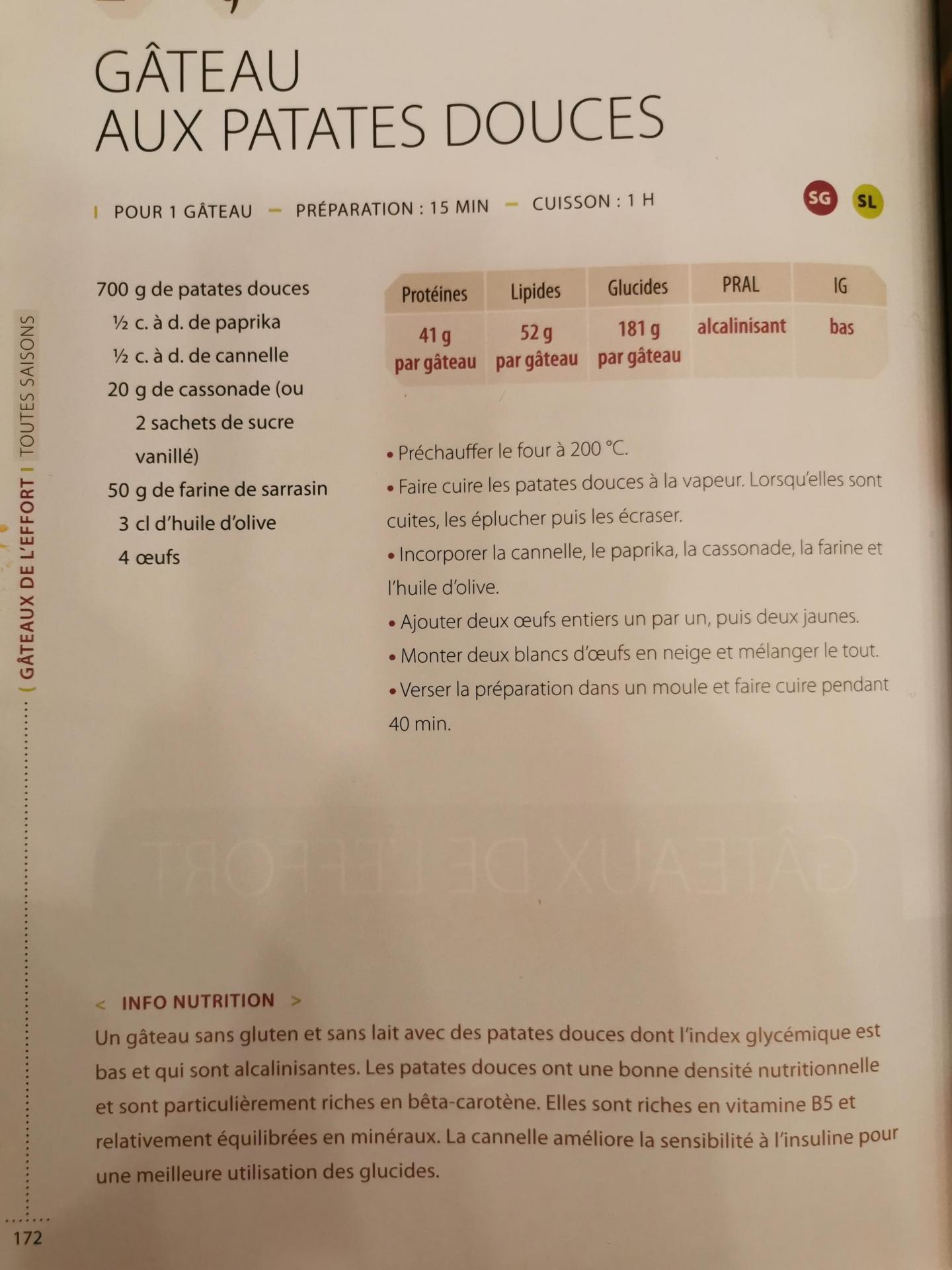 Un gâteau sans gluten et sans lait avec des patates douces dont l'index glycémique est bas et qui sont alcalinisantes. Les patates douces ont une bonne densité nutritionnelle et sont particulièrement riches en bêta-carotène. Elles sont riches en vitamine B5 et relativement équilibrées en minéraux. La cannelle améliore la sensibilité à l'insuline pour une meilleure utilisation des glucides.